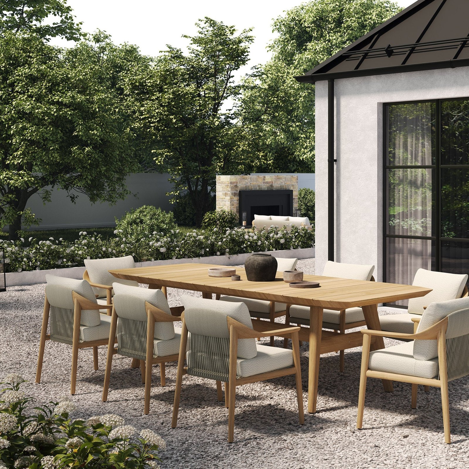 The table’s silhouette is harmonious of form and function, its sleek and angular legs supporting a surface that is both expansive and welcoming. The slatted top, reminiscent of classic style, allows for a play of light and air, adding an element of tactile pleasure to the visual grace. Each gathering at this table promises to be bathed in the warmth of natural wood, set against the backdrop of the open air, making it an ideal stage for memorable alfresco dining experiences.