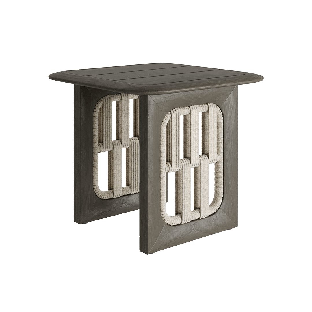 The table’s top, with its harmonious slats of teak, is complemented by the hand laced rope that forms the body of the piece, offering visual intrigue. These handwoven panels allow for a playful dance of light and shadow, adding depth to the design. The darkened teak finish lends a warm, inviting tone to the table, suggesting a sense of muted luxury.
