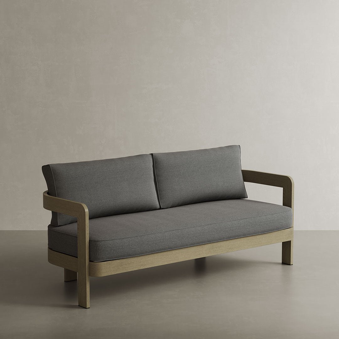 The N3 collection pays homage to the modern concept of proportion and architectural intricacy. The N3 Sofa is meticulously constructed from robust aluminium with a realistic wood effect powder coated finish. Its clean lines are juxtaposed with its gracefully curved backrest, accompanied by two supporting side legs and and two subtle legs at the rear.