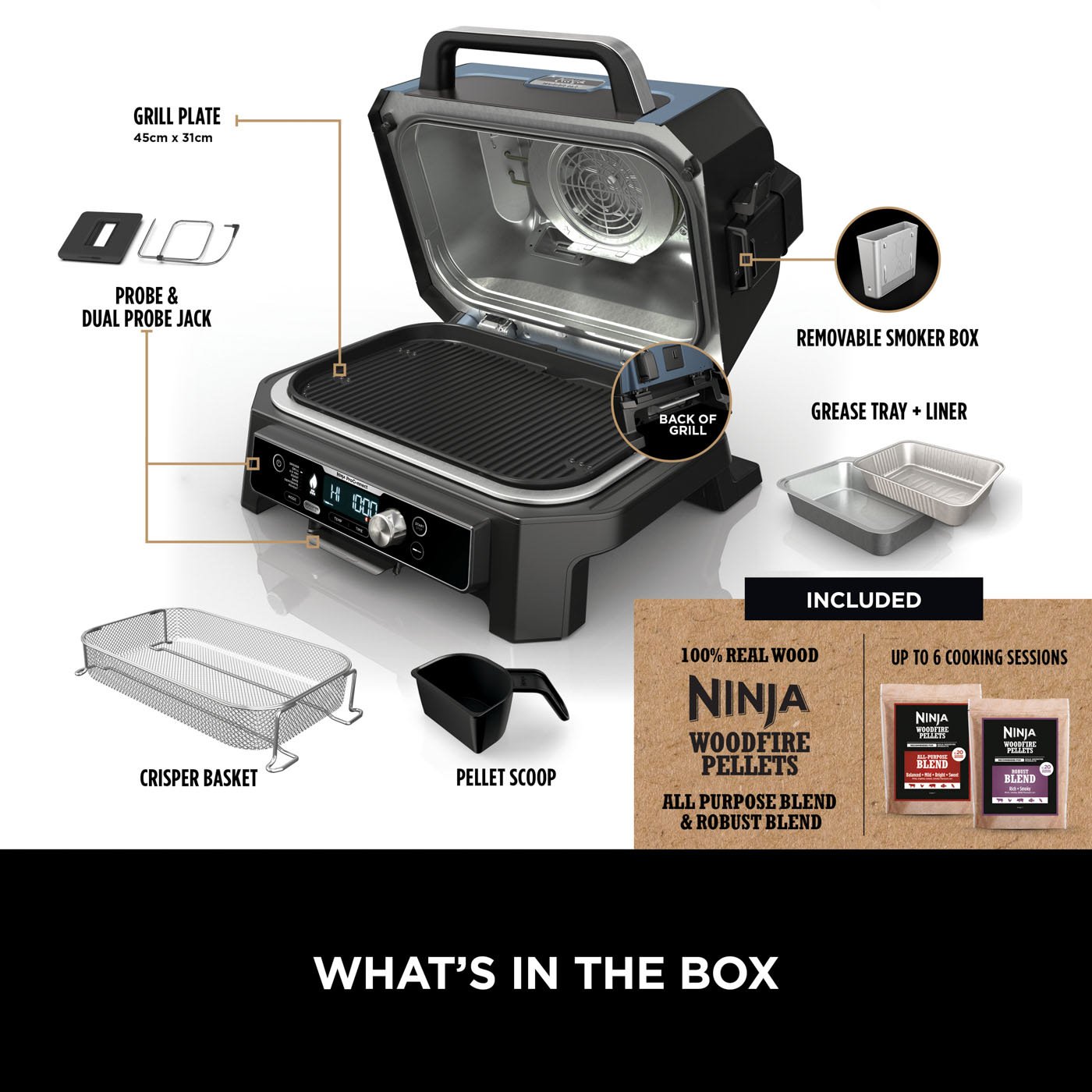 Powered by electricity, flavoured by real wood pellets. The integrated smoker box burns 100% natural wood pellets for authentic smoky flavours. Smoke low and slow for tender, juicy results, or quickly infuse any cooking function with BBQ flavours. This grill includes 2x Ninja Woodfire Pellet Starter Packs, enough for 6 cooking sessions, and a scoop.